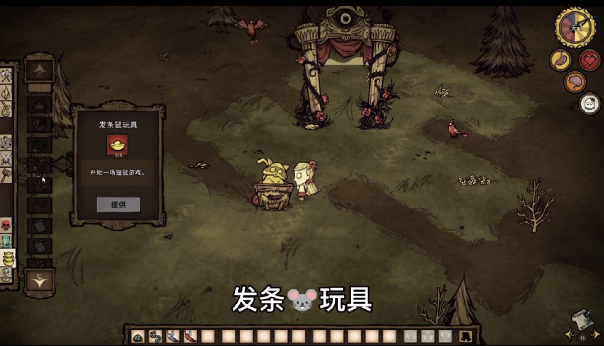 玩家在飢荒里獲得的幸運黃金可以通過在貢品欄里來進行兌換活動道具,例如發條老鼠玩具、火雞羽毛套裝以及逗貓小魚套裝。