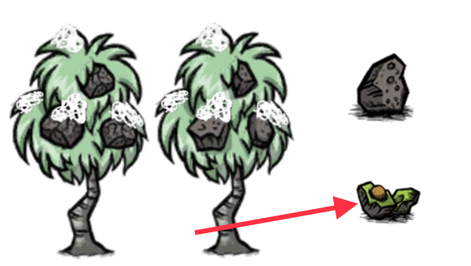 飢荒之中的石果用鎬子挖開獲得成熟石果、石頭、石果苗三個其中之一,石果樹可以用鏟子移植,成熟石果可以當做蔬菜來使用。