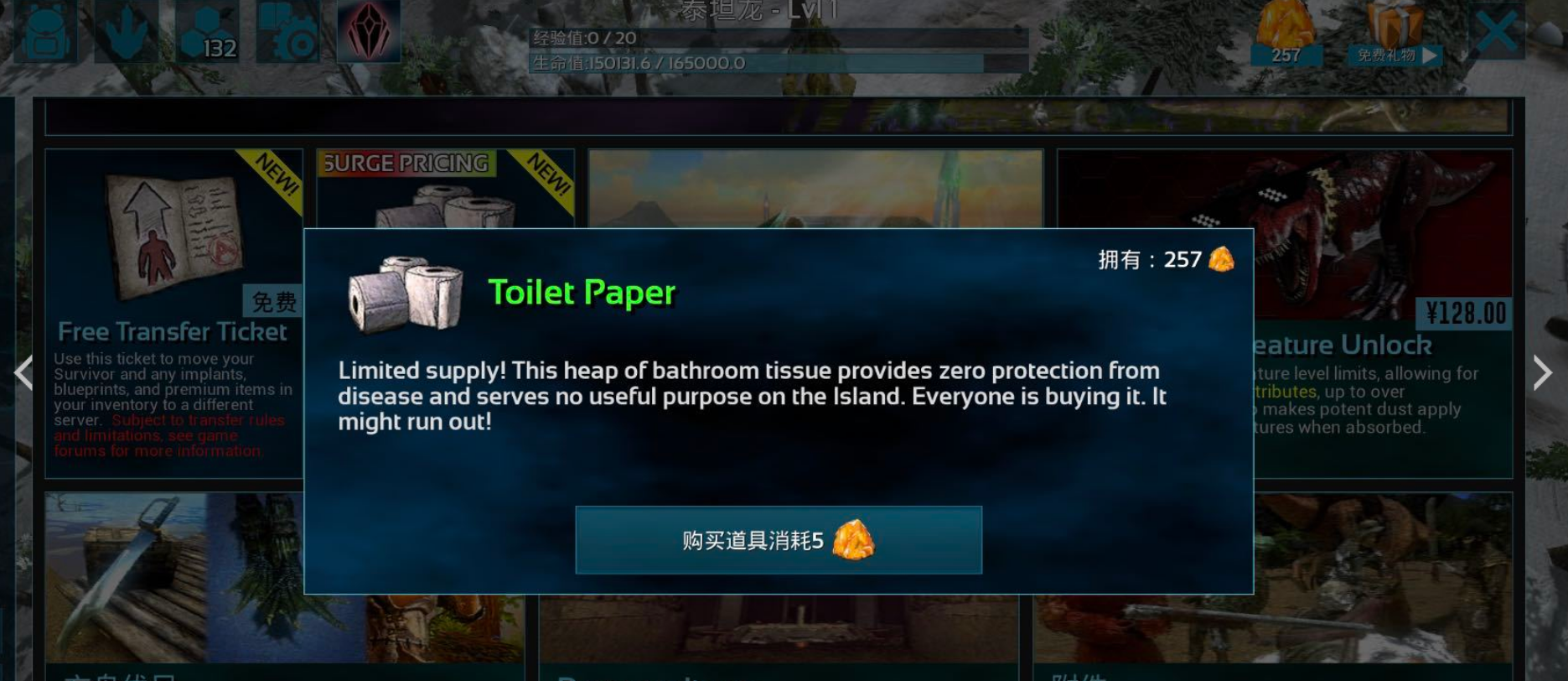 首頁 方舟:生存進化 問答 方舟toilet paper有什麼用? 2023-01-28 《方舟:生存進化》游戲中的Toilet Paper是廁紙,對他的描述是:」供應有限!這堆浴室紙巾對疾病沒有任何保護作用,在島上也沒有任何用處。每個人都在買它。他可能會用完!」描述中明確表示了「no useful」意思是沒用的。