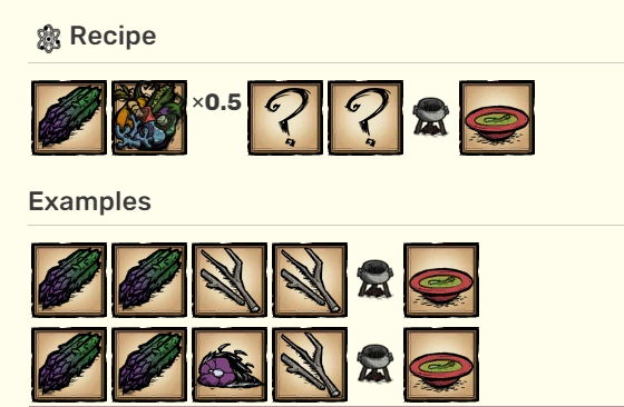 首頁 飢荒 問答 飢荒蘆筍食譜是什麼? 2023-01-29 飢荒蘆筍是一種蔬菜類食物,可用作食譜蘆筍湯。蘆筍湯需要至少一個生或者熟的蘆筍和至少0.5蔬菜度。蘆筍湯在喝下後回復20生命值,18.75飽食度和5理智值。