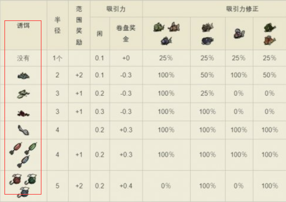 在飢荒聯機版遊戲中,海釣竿魚餌有腐爛的食物、種子、漿果、扭曲的刀叉、硝石、牛毛、紅蘑菇、藍蘑菇、綠蘑菇等。