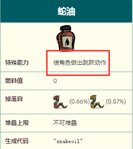 首頁 飢荒 問答 飢荒海難蛇油有什麼用? 2023-01-30 《饑荒》游戲中蛇油的作用:蛇油標注著可飲用,不可疊加,可反復使用。喝過之後似乎沒有太多效果,喝完右鍵點地下會跳一下。然後幾乎就沒什麼用了,不過玩家可以當做收藏品一樣收藏起來。