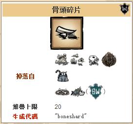 首頁 飢荒 問答 饑荒骨頭碎片有什麼用? 2023-01-30 饑荒骨頭碎片可以用作製作雨衣(觸手皮2個 草繩子倆捆 骨頭碎片2個在煉金術引擎處合成)防雨。還可以製作獨眼雨帽(巨鹿眼球X1 小樹枝X15 骨頭碎片X4在煉金術引擎處合成)100%防雨。