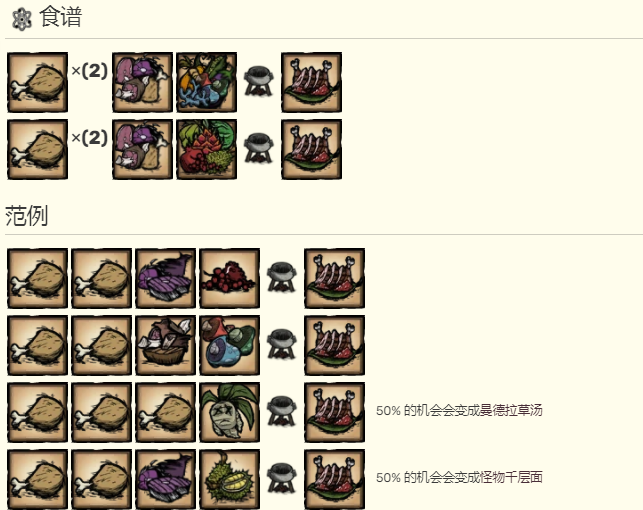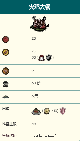 1、饑荒鳥腿大餐(火雞大餐)是一種肉類食物,可提供20點血量、75點飽食度(女武神為90點)和5點精神值。
