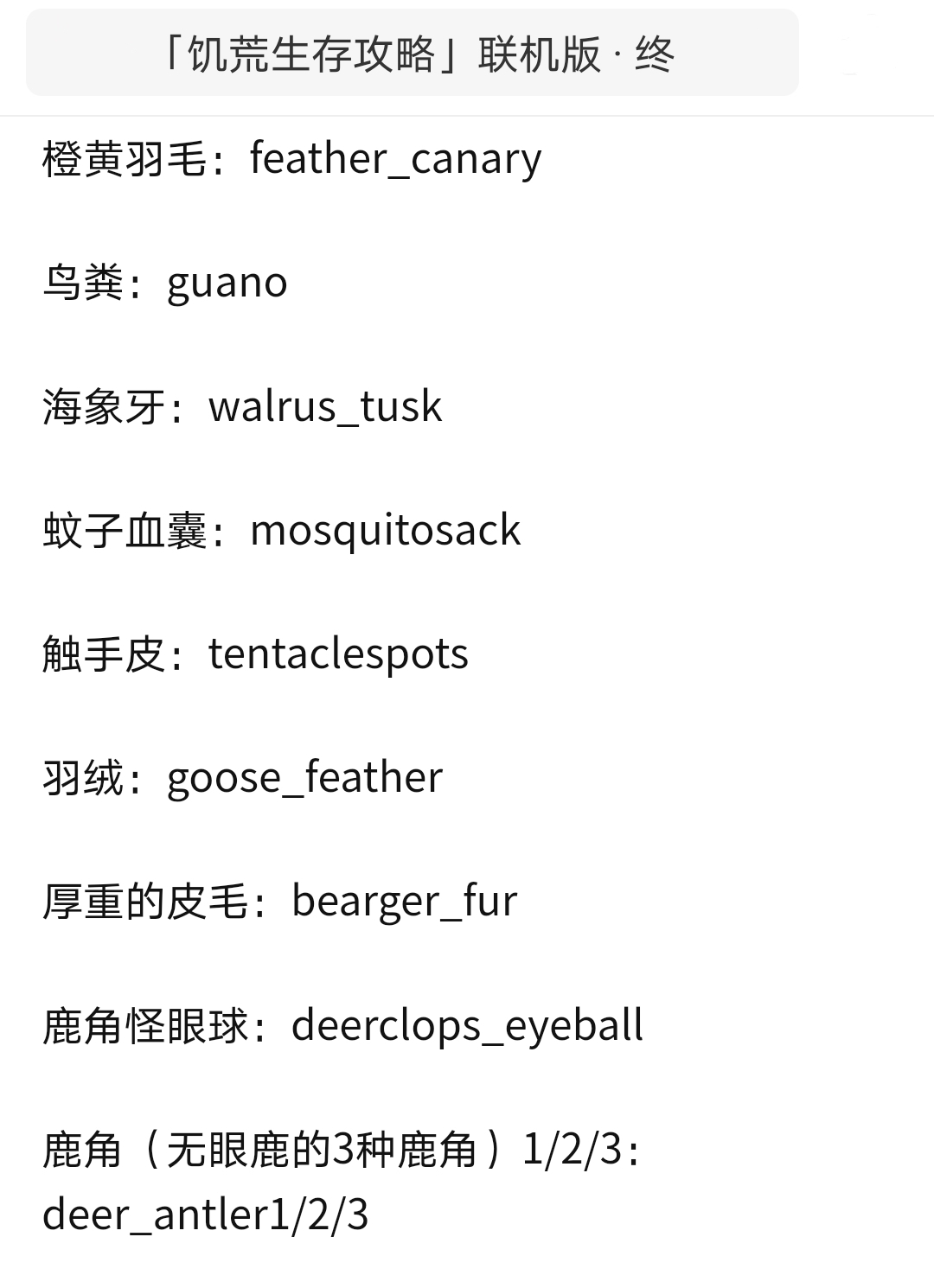 首頁 飢荒 問答 飢荒聯機版無眼鹿角代碼是多少? 2023-01-30 飢荒聯機版中無眼鹿角(三種)的代碼是deer_antler1/2/3;鹿角共有四種,不過無眼鹿只會掉落其中的三種,第四種麋鹿角被克勞斯所擁有;無眼鹿也叫無晴鹿,不會主動攻擊人,驅趕無眼鹿去撞擊樹木等物體時可使鹿角脫落。