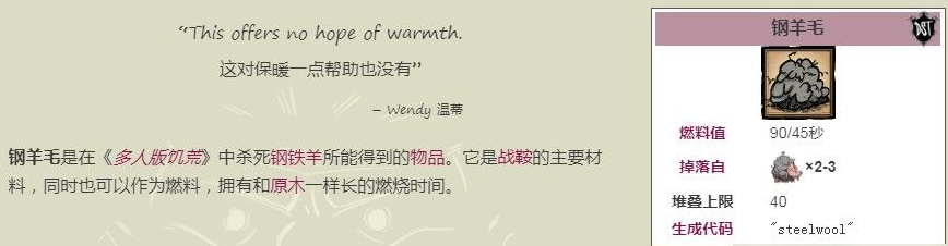 首頁 飢荒 問答 饑荒鋼絲絨有什麼用? 2023-01-31 饑荒游戲中,鋼絲絨也就是鋼羊毛,作用是製作戰鬥牛鞍或者鋼羊毛刷,玩家用兩個鋼絲絨、錘子、黑色羽毛可以合成騎士頭盔,鋼絲絨也可作為燃料,擁有和原木一樣長的燃燒時間,鋼絲絨產自鋼鐵羊死亡的掉落。