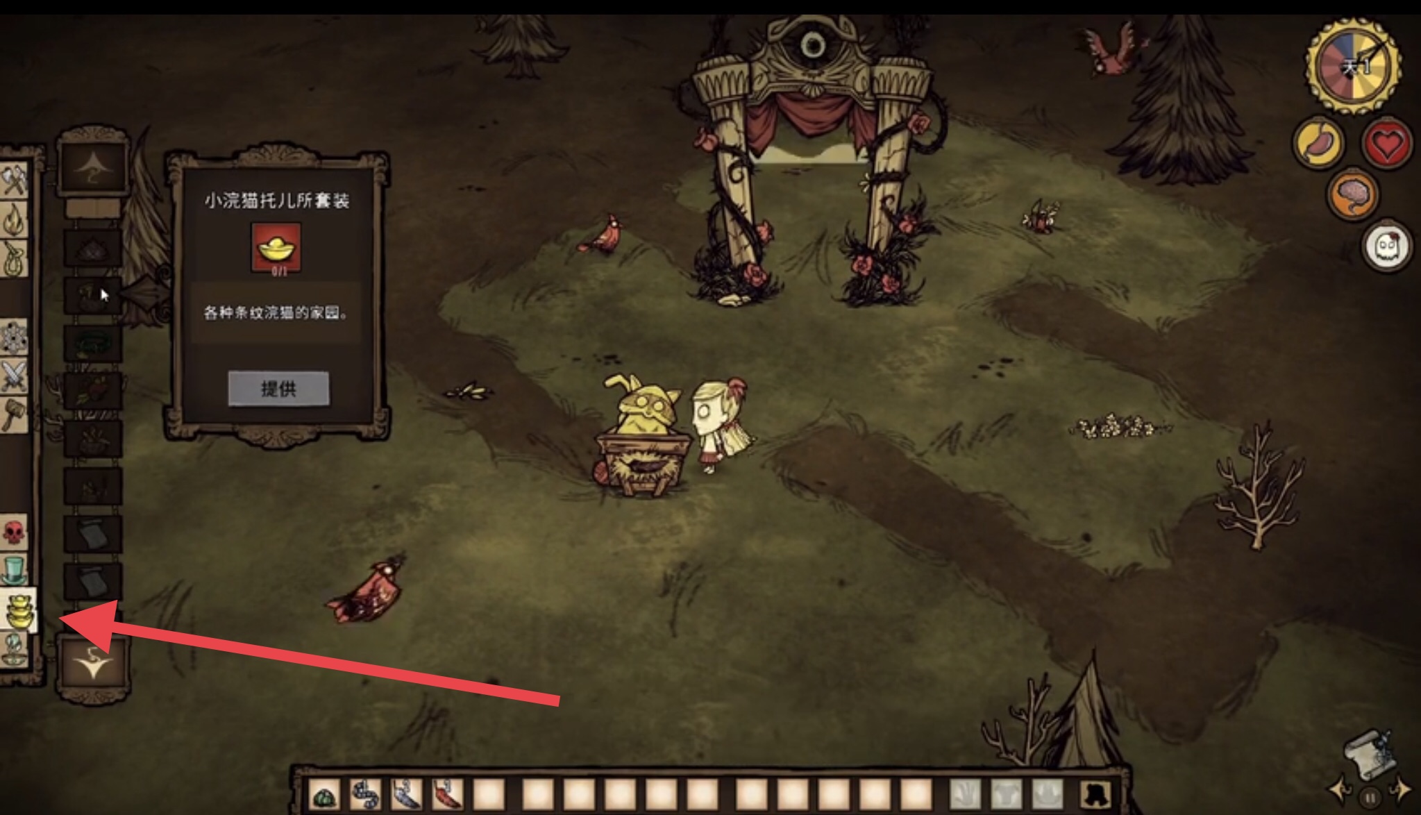 饑荒聯機版幸運黃金可以在貢品欄里來進行兌換其他的物品如小浣貓托兒所套裝、小浣貓項圈以及大虎等物品(如下圖所示)。