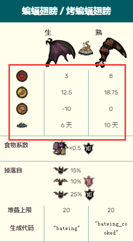 飢荒蝙蝠翅膀為擊殺蝙蝠時掉落,不能參與烹飪料理製作,蝙蝠翅膀可以生吃或者烤熟後使用,食用後可恢復狀態參考如下。