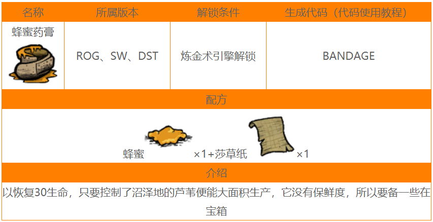 饑荒蜂蜜藥膏代碼為BANDAGE。蜂蜜藥膏可以使用1個莎草紙和2個蜂蜜在煉金引擎處製作。