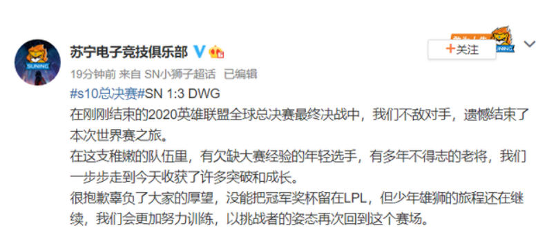 賽事結束後,粉絲和LPL的其他戰隊也紛紛在SN官博下為他們加油打氣,蘇寧電競董事長張康陽和SN戰隊的成員相繼發博給到相應的回復。