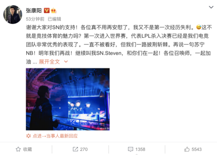 蘇寧電競董事長張康陽:謝謝大家對SN的支持!
