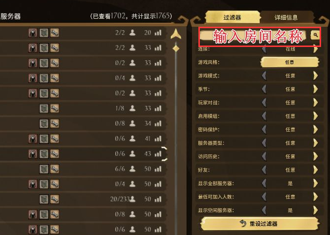4、房間列表有很多房間可以加入,點擊(過濾器)。