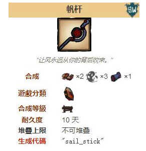 饑荒海難帆桿是海難DLC引入的物品,它需要2個黑曜石,3個噩夢燃料和1個魔法海豹來製作,並需要靠近黑曜石工作台或佩戴思維風暴帽子,裝備帆桿後,使風的方向與自己的移動方向相同,並慢慢消耗耐久,只能改變風向,但不能製造風,可以和海螺配合使用。