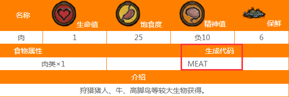 飢荒大肉的生成代碼是什麼MEAT。肉是一種可以從豬人、豬人守衛、蜻蜓龍、麋鹿鵝、和狂暴豬人等生物身上取得的食物,可以用在許多的的食譜之中。