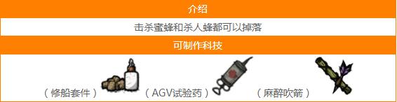 2、擊殺蜜蜂和殺人蜂都可以掉落蜂刺,蜂刺可用於製作修船套件、麻醉吹箭等。