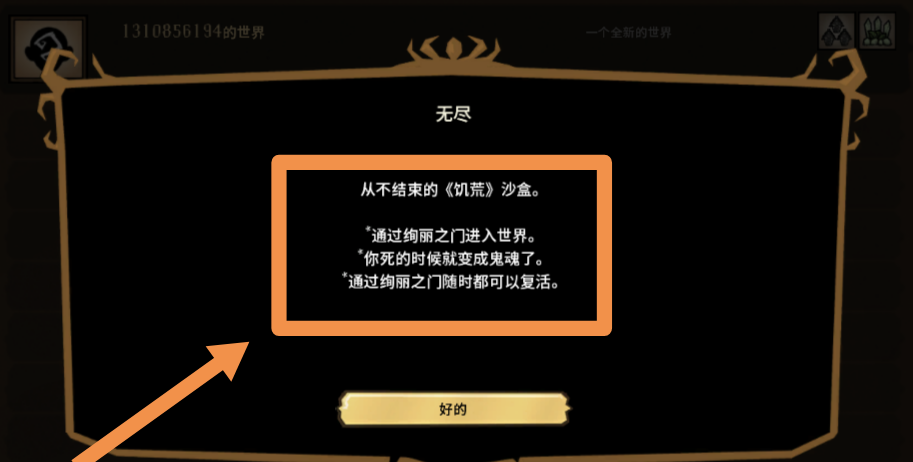 在饑荒之中的無盡模式是指玩家在死亡後可以通過使用出生的惡魔之門來複活,地圖就算所有人變成鬼魂也不會重置。