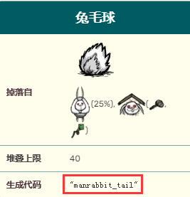 首頁 飢荒 問答 饑荒兔絨代碼是什麼? 2023-02-06 饑荒兔絨(兔毛球)代碼是"manrabbit_tail"。由殺死兔人或是使用錘子和解構法杖拆毀洞穴中的胡蘿蔔屋後取得,兔子並不會掉落兔毛球。