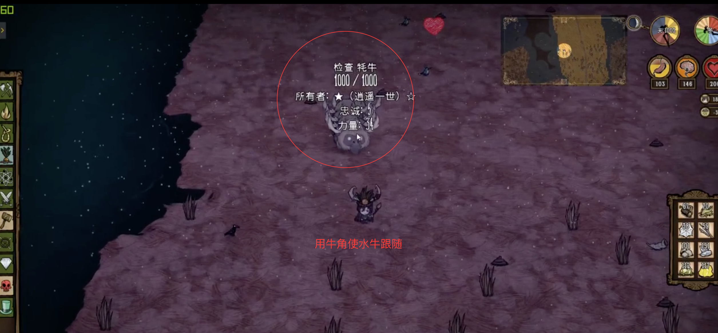 在飢荒游戲中,遷移水牛需要用到牛角,玩家殺死野牛,有33%的概率掉落,玩家可以直接用牛角讓水牛跟隨,注意不要離牛的距離太遠。