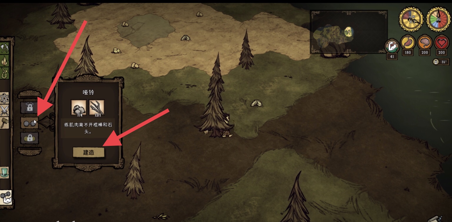 首頁 飢荒 問答 饑荒沃爾夫岡啞鈴怎麼做? 2023-02-07 1、首先玩家在使用沃爾夫岡這個角色後左側的製作面板里會多出一個強人板塊點擊強人板塊2、然後在點擊強人板塊後玩家會看到啞鈴的製作方式需要用一個小樹枝和四個石塊來進行製作也可以用更高級材料製作黃金啞鈴具體如下圖所示