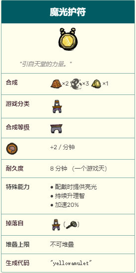首頁 飢荒 問答 飢荒魔光護符怎麼充能? 2023-02-08 饑荒魔光護符是通過噩夢燃料補充的。魔光護符能夠使用8分鍾,1個噩夢燃料可以補充3分鍾的耐久度,當耐久度降到零時它就會消失。它能夠提供20%的移動速度。