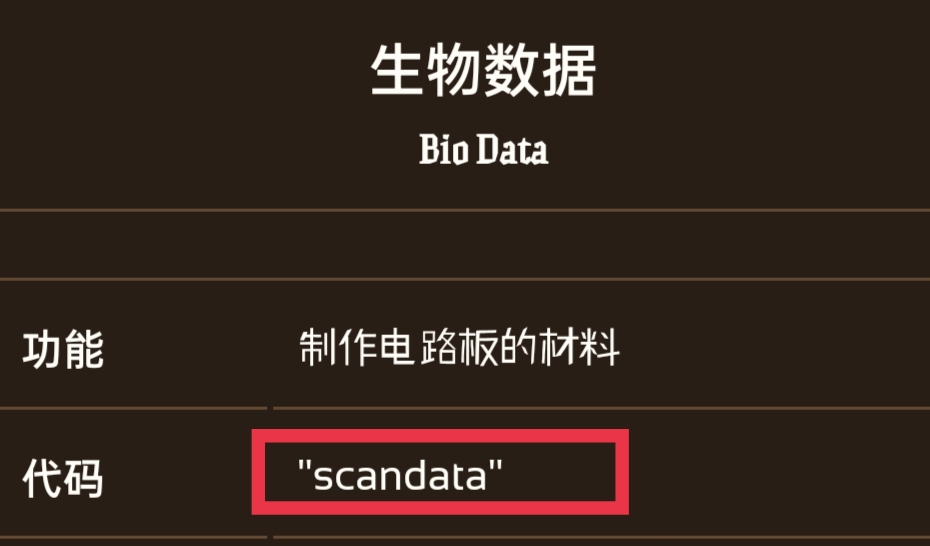 在饑荒這款游戲中,生物數據的代碼是scandata,通過生物分析掃描儀掃描某些特定的生物來獲得,是所有電路板的製作材料。