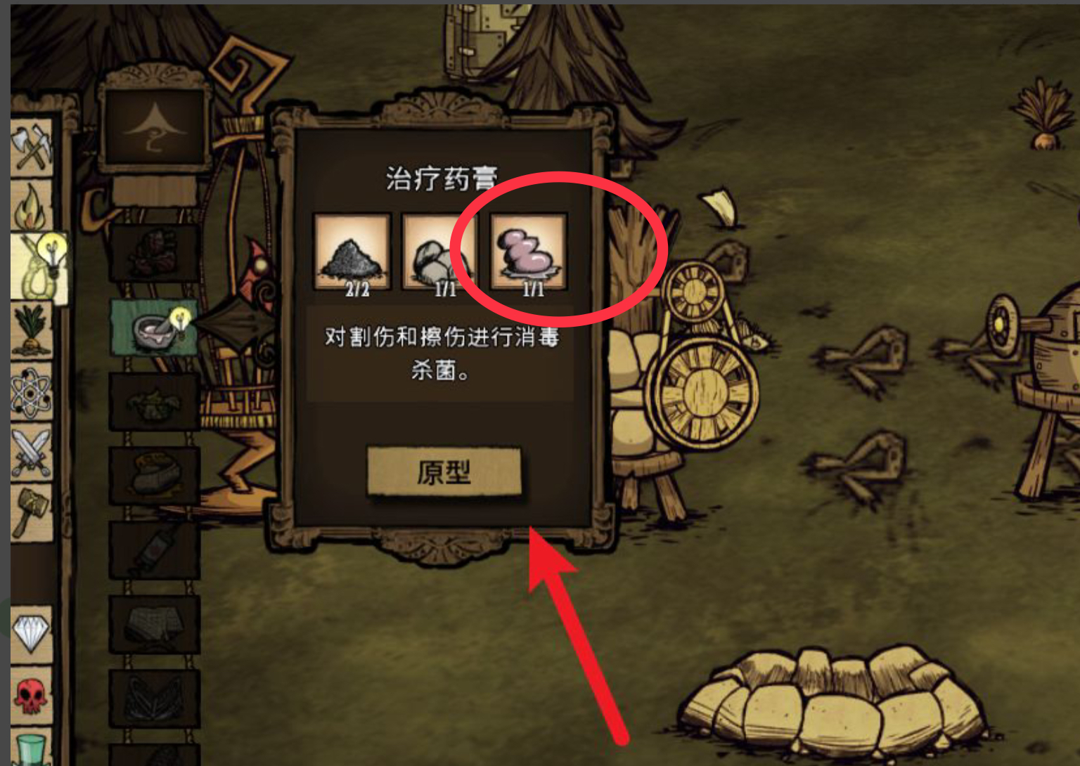 在飢荒之中玩家在獲得蜘蛛腺體後可以通過使用科學機器然後再生存一欄中使用一個腺體一個石塊兩個灰燼來進行製作藥膏