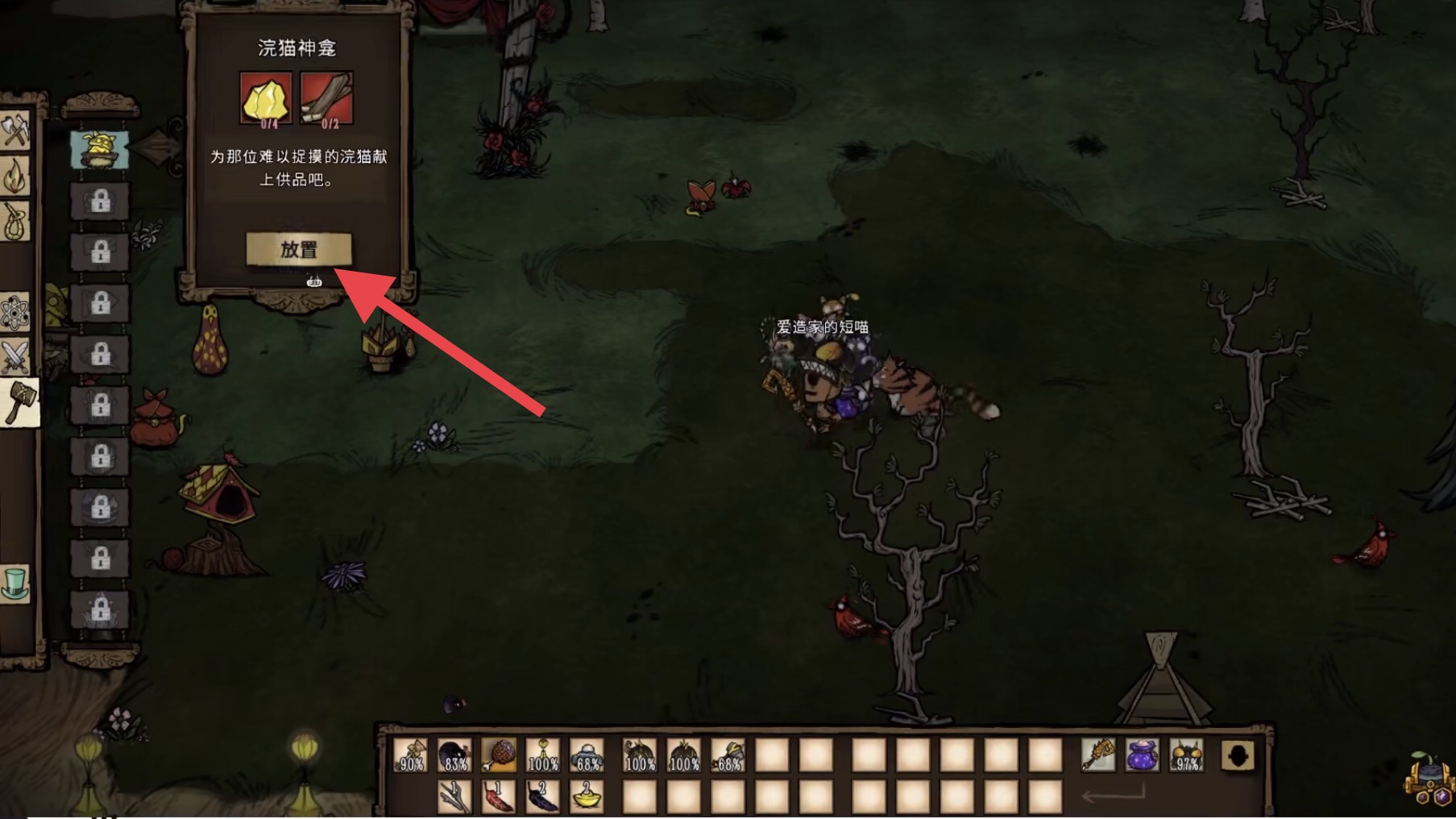 在饑荒之中玩家可以在製作欄里點擊建築那個選項就可以在裡面看到浣貓神龕收集材料後就可以製作了具體如下圖所示
