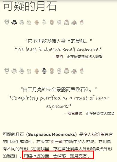 根據饑荒官方百科,饑荒里可疑的月岩是一種存在著狂暴豬人外形和獵犬外形的雕塑,如果玩家能用鎬挖掘的話,會掉落一顆月亮石。