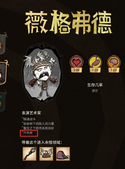 饑荒是一款發售於2016年4月22日的游戲,在游戲中每個人物都有著自己的特點,其中薇格弗德的特點便是不能吃素,她只能吃肉和肉類製品。
