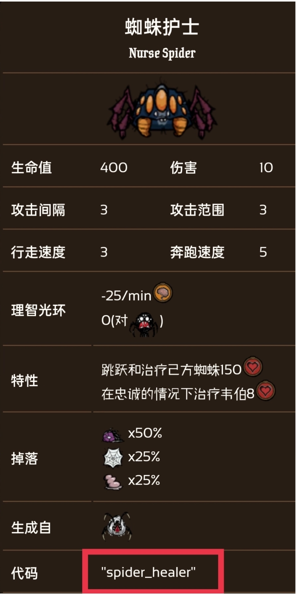 首頁 飢荒 問答 饑荒護士蜘蛛代碼是什麼? 2023-02-13 在饑荒里蜘蛛護士的代碼見下圖紅框處;蜘蛛護士具有獨特的治療能力,能定期治療周圍8單位半徑內的所有蜘蛛150生命值(僅針對己方),並且有8秒的一個冷卻時間。