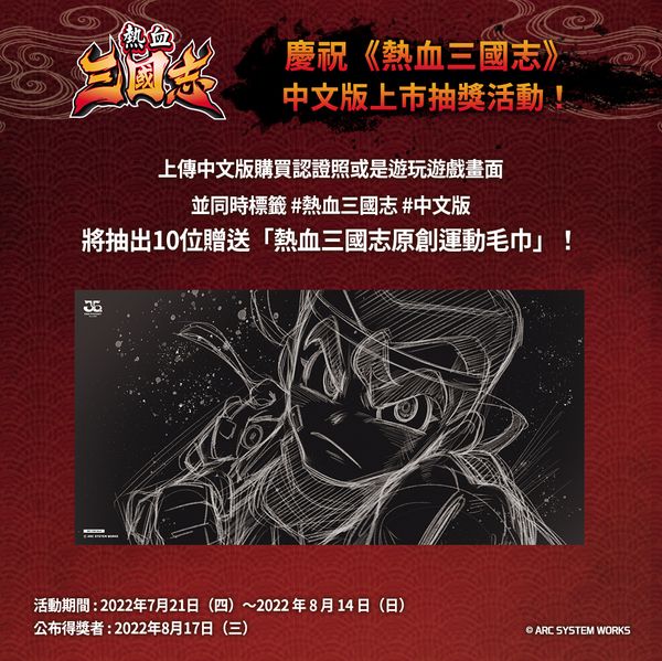 ● 活動獎品:「熱血叄國志原創運動毛巾」(預計將抽出10名)
