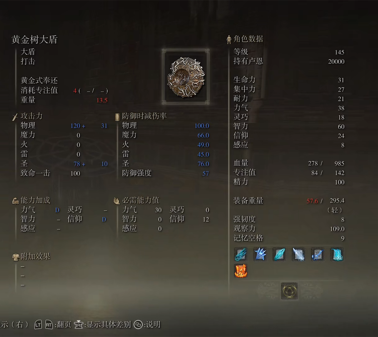黃金樹立誓:簡單暴力的增傷buff,對龍雷和黃金樹大盾的戰技均有提升(和老將戰旗衝突)。