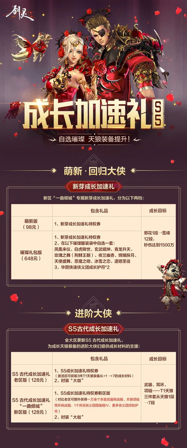 《劍靈》全新大區【一曲傾城】也在此次更新中同步開放,與新區一同到來的還有專屬成長加速活動。新區玩家專享新芽成長加速禮,分為兩檔,分別是萌新版和璀璨禮包版,助力新區玩家快速成長。除此之外,全大區也更新了S5古代成長加速禮,為成長天狼裝備的進階大俠們提供成長材料的支援。
