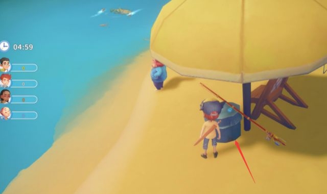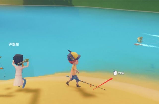 2、先走到岸邊不要太靠近,也不要太遠,走到出現滑鼠的位置之後左鍵,點擊釣魚。