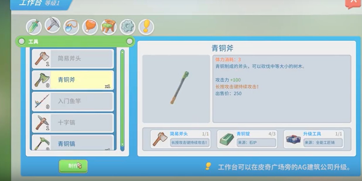 首頁 波西亞時光 問答 波西亞時光怎麼升級斧頭? 2023-02-14 1、波西亞時光將簡易石斧升級為青銅斧需要在全能工匠鋪購買升級工具。2、升級成青銅斧需要簡易斧頭1把、青銅錠3個、升級工具1個這些材料在工作台進行製作就可以得到青銅斧。