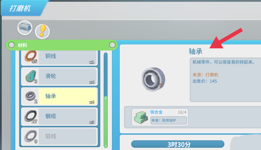 首頁 波西亞時光 問答 波西亞時光軸承怎麼做? 2023-02-15 1.首先要做這個軸承你需要有鉛礦石。2.然後至少有民用熔爐才能使用鉛礦石。3.製作出錫合金這種材料,不過用的地方比較少,做一些存貨就可以了。4.之後來到打磨機這裡,添加能源之後點擊軸承製作,製作一個要3小時30分鍾。