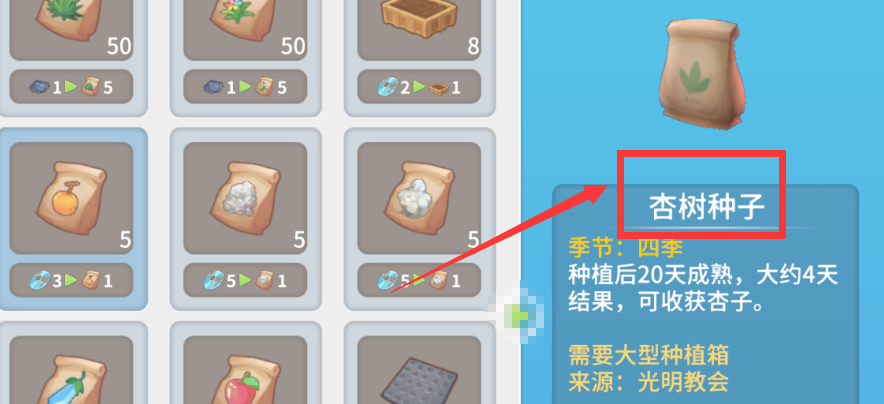 首頁 波西亞時光 問答 波西亞時光種子在哪裡買? 2023-02-15 玩家進入游戲後,點擊上方菜單中的地圖選項,點擊光明教會,選擇前往,在這里即可購買種子,比如,點擊對應的杏樹種子,購買即可,如下圖所示: