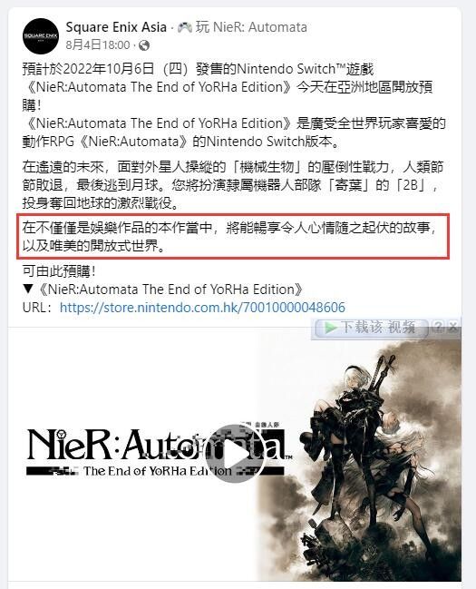 任天堂及SE確認《尼爾:機械紀元》將在NS平台提供繁簡中文版,NS《尼爾:自動人形 -The End of YoRHa 版-》會收錄其它機種的DLC「3C3C1D119440927」,以及本作追加的免費DLC「6C2P4A118680823」(服裝等)。
