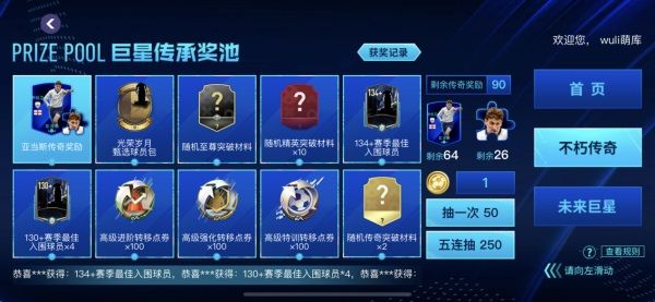 巨星傳承獎池中,玩家可以使用遊戲幣進行單抽或五連抽,累計五次抽獎次數必得傳奇獎勵,傳奇獎勵共有90個,內含64張專屬獎池指定傳奇球員卡及26個專屬獎池指定積分。