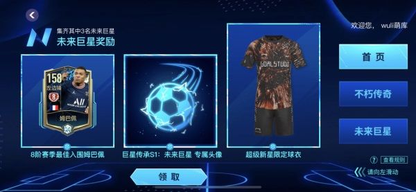 玩家集齊其中3名未來巨星後,可以領取8階賽季最佳入圍姆巴佩、巨星傳承S1:未來巨星 專屬頭像、超級新星限定球衣。