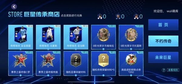 巨星傳承商店中,玩家可以使用積分換取巨星傳承第一賽季傳奇球員、9階光榮歲月球員、賽季之星終極球員以及不同的豐厚資源。