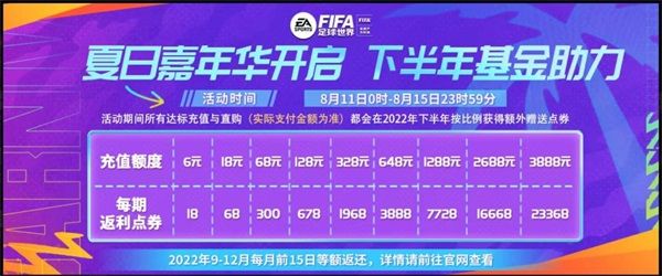 隨著夏日嘉年華的開啟,下半年基金助力玩家暢享綠茵!玩家充值不同額度,即可在2022年9-12月收穫不同數量點券的返利,超值優惠,不容錯過!