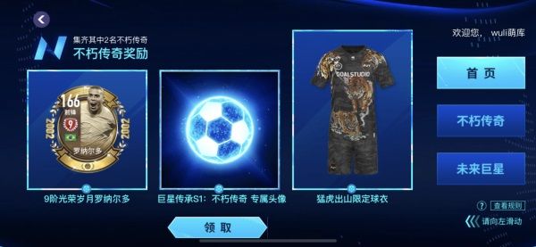 玩家集齊其中2名不朽傳奇後,可以領取9階光榮歲月羅納爾多、巨星傳承S1:不朽傳奇 專屬頭像、猛虎出山限定球衣。