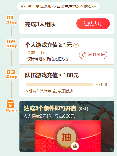 【活動內容】:完成3人組隊、個人遊戲充值≥1元、隊伍遊戲充值≥188元三個任務,即可開啟紅包,保底2元起,更有機率暴擊666元!
