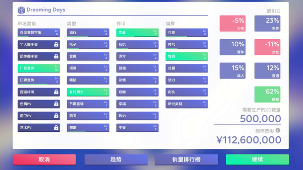 您可以自行決定作詞作曲編曲編舞,指名由誰做團體的C位,決定隊列中有多少位成員。玩家來指揮歌曲的創作,並製作成CD發行。當然,還要注意成本以避免造成赤字。