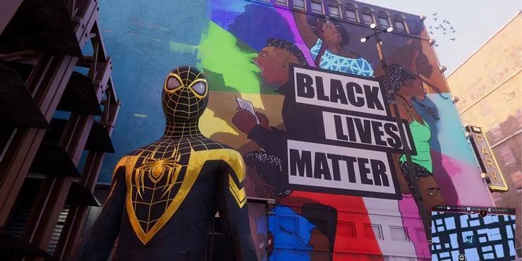 在遊戲中,玩家可以直接看到這張壁畫,位置大概在玩家解鎖「Uptown Pride」戰衣時的支線任務地點。《漫威蜘蛛俠:邁爾斯·莫拉萊斯》的開發商Insomniac Games和發行商索尼也是今年初直接表達了對「黑命貴」運動支持的廠商。