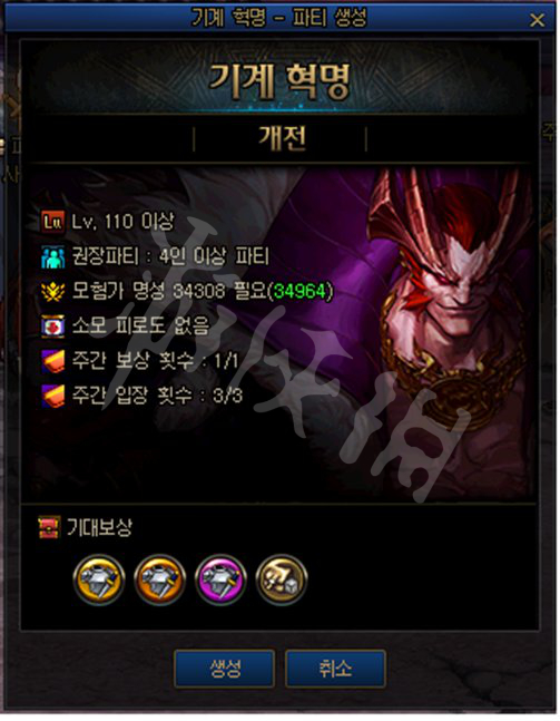 完成機械革命:開戰主線任務後,110級且名望值達到34308以上的角色可通過[機械革命:開戰]專屬頻道單人或最多4人組隊進入全新地下城[機械革命:開戰],入場時不會消耗疲勞也不需要門票。
