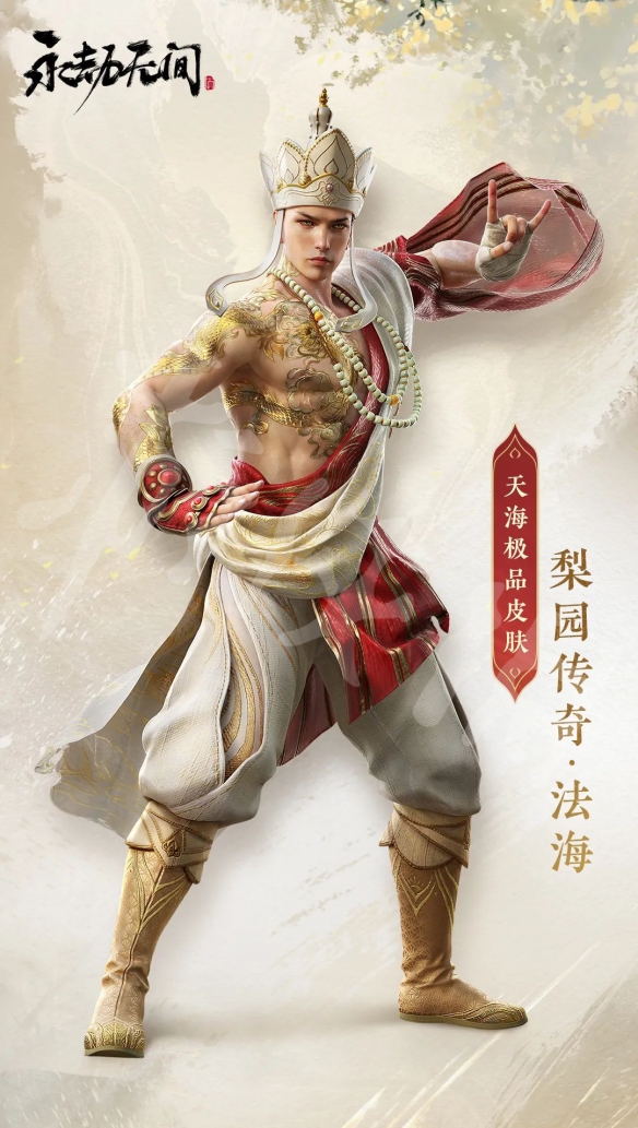 素白僧袍之上半裹著金紅的袈裟,裸露肌膚之上浮現的暗金色紋路與胸前垂墜的佛珠勾勒出幾分庄嚴的神性,不怒自威,無念無情。