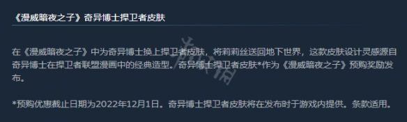 目前玩家可以直接預購該遊戲,現在預購還可以獲得奇異博士捍衛者皮膚。