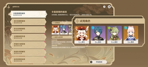 關卡中,旅行者只能使用給定的試用角色進行挑戰,每個關卡的試用角色各不相同。試用角色無法產生元素共鳴。